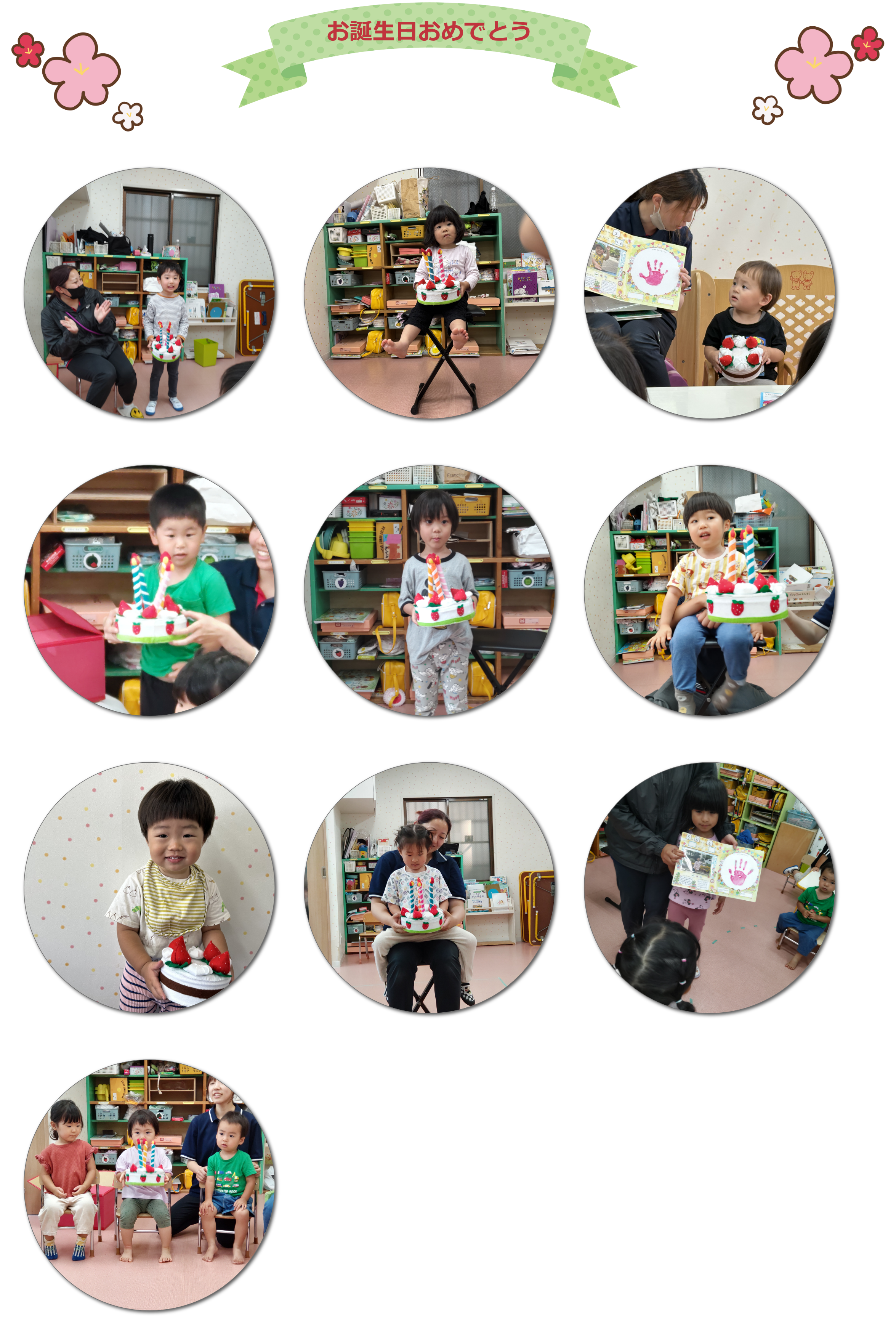花キュー園特製ケーキや 2 歳以上児さんは自分の得意なことをみんなに見てもらい、みんなにお祝いしてもらいます。